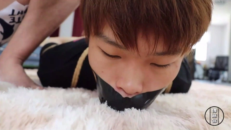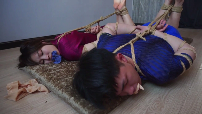 片段4:帅哥康行与女友小琛被歹人入室劫持后先用原味内裤塞嘴,二人互相解绳子被发现,歹人生气将他们捆成驷马并脱掉二人脚上穿的原味锦纶丝袜交换塞入情侣二人口中,并用胶布绷带一圈圈将他们嘴封严实。
