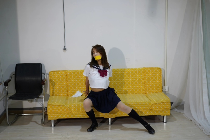 全程舞蹈,先后黄色、透明胶带封嘴,丝袜堵嘴,黑丝白丝蒙眼,中筒丝袜蒙眼,镣铐束缚,增加跳舞难度。