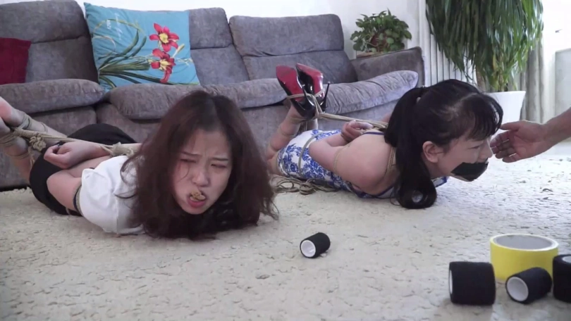 在二女一筹莫展之际锁哥得意洋洋出来,说我捆绑手法不错吧,你们没那么容易挣脱开,现在还有点时间还玩吗,二女拼命摇头表示放弃希望锁哥解开,可锁哥哈哈一笑说你们不想玩了,我还没玩够呢!锁哥将二女捆成驷马放置在沙发前地上,并表示打赌游戏二女输了,就得接受自己的惩罚。