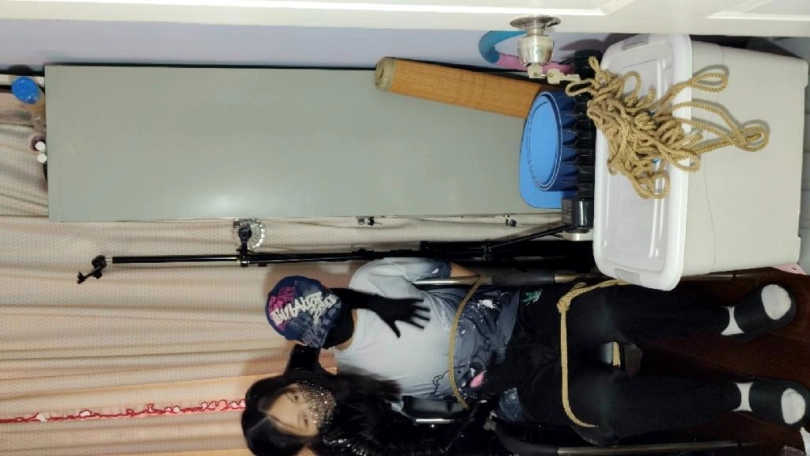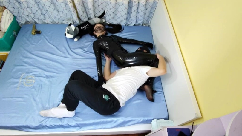 妹子开始穿着丝袜紧身衣C字裤躺在床上,用衣架把皮衣挂起来,皮衣也出镜,接到电话去解救关押的人质,于是摘下皮衣,穿上皮衣穿上黑漆皮长靴,带上紧身腰封,带上面具,枪绑腿上,出发。