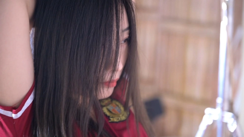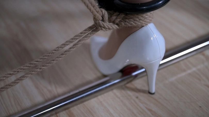 背手固定是给萱萱带上脚镣,然后双手抱头手交叉后与脚镣部分相连,中间也有一根麻绳把脚镣的链子与手和架子相连,这样就可以把四肢相联固定。第二个跪责,其实是相当难受的,萱萱在这个姿势下是不平衡的,要想稳定就得依靠腰腹的力量,以至于在接铐的时候,她一时不能直起身子来。本片还加入些TK和打屁股的元素。