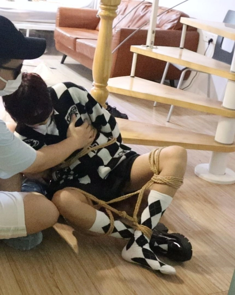 ps(这里出现绳子卡到B的手腕上 导致手臂剧痛 女孩超级疼 连忙把吊起来的手臂放下,后面换上了手链绑到柱子身后