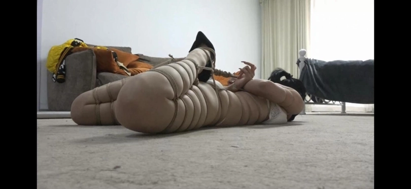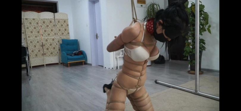 眼镜男子在将凯文捆着溜达了一圈之后,重新将她驷马捆绑起来,还不忘再次让她享受一下按摩服务。等到男子玩的差不多了,男子将凯文直立膝盖顶地捆绑好,这种姿势是很难受的,既要承受手臂的疼痛,还要承受膝盖长时间跪在地上,也是非常痛的,可是辛苦模特了~