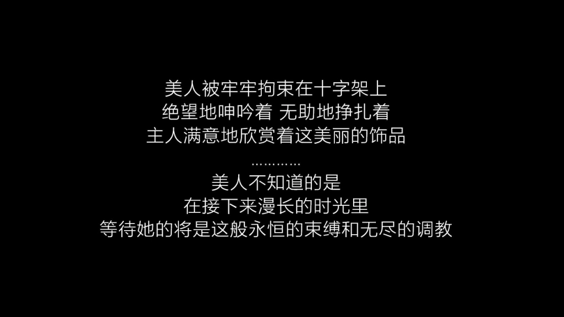 接上集,美人(柳洋饰)被人贩组织绑架后拍卖。被新主人买下后带回家,主人开始了对美人的调教。换上性感的衣服后的美人被带到了十字架前,主人用绳子和皮带将美人牢牢捆绑在铁十字架上。无助的美人在十字架上绝望地挣扎和呻吟……