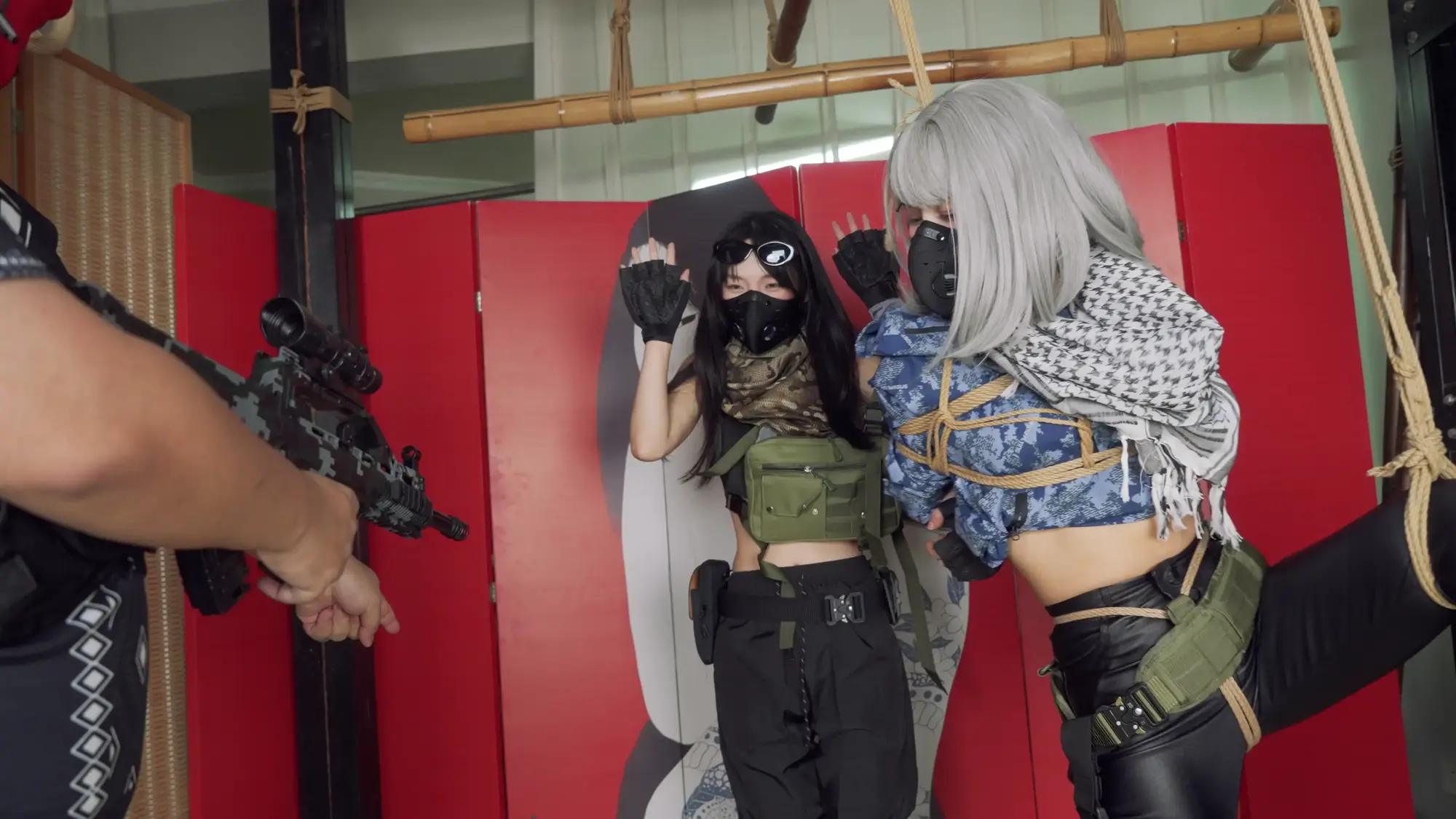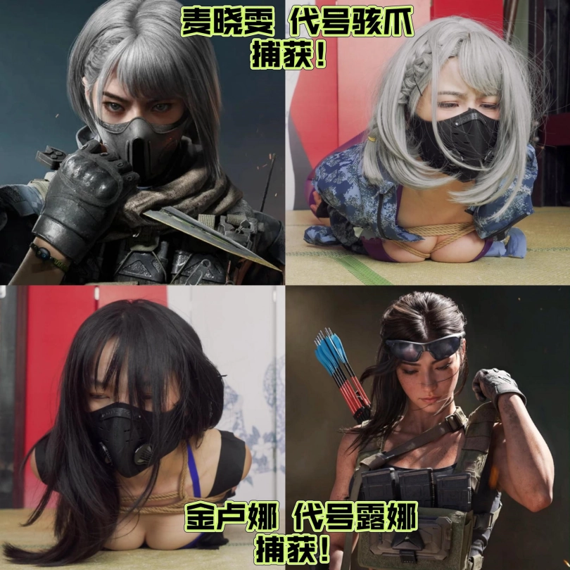 剧情这次也很简单,小0扮演的麦晓雯日常跑刀搜刮物资,运气爆表捡到了非洲之心,正当她准备撤离的时候,被嗷嗷扮演的露娜抓住,露娜夺走了非洲之心,并将麦小鼠单腿吊缚起来各种玩弄,正当露娜玩的开心的时候,一旁的小兵听到动静,举枪治服了露娜,也将她捆了起来。