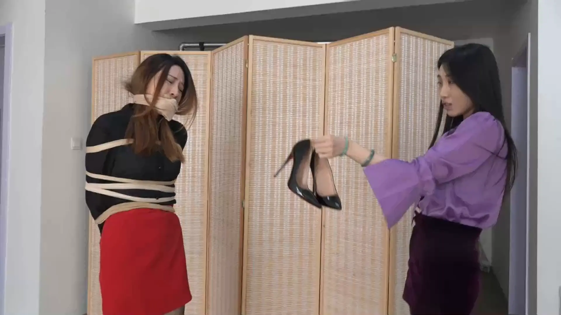 楼下美女被绑起来后,被逼着穿上性感的包臀裙、黑丝袜+高跟鞋