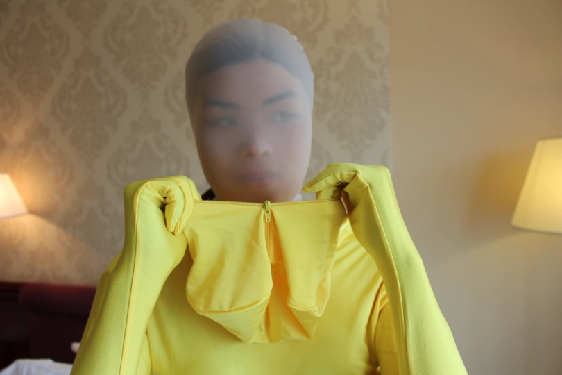 Susan妹子穿着透亮的肉色zentai打底,分别换上了斑马纹,黑色镂空和亮黄色的紧身衣。
