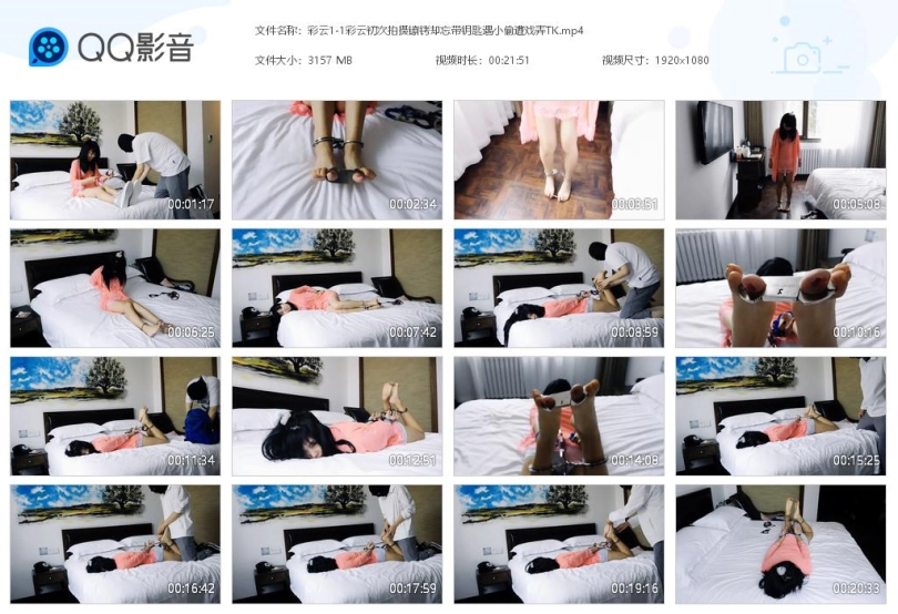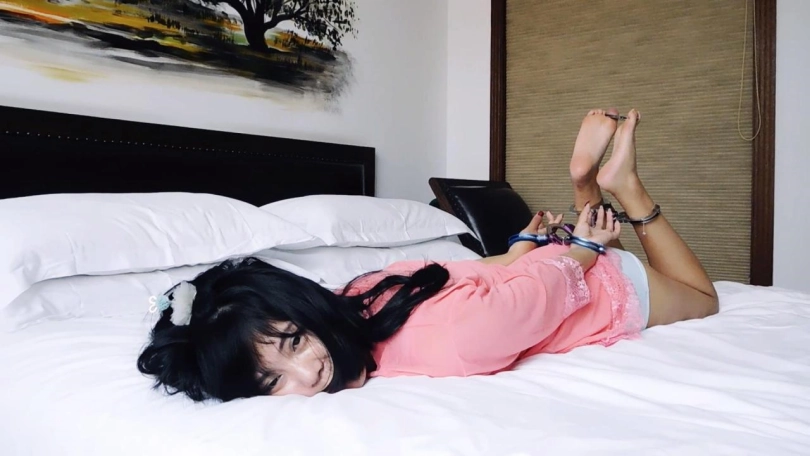 妹子和摄影师一起进门,妹子第一次来体验拍镣铐,对一切充满了好奇,而摄影师也是第一次拍这个女孩,在拍之前先试试道具。摄影师首先脱下妹子的鞋袜,铐上脚铐和脚趾铐,问问妹子感觉如何,妹子觉得挺舒服的。妹子先在床上活动下,然后,下地走走感受下。摄影师给妹子戴上背铐,问问妹子感觉如何,妹子觉得也还挺好。妹子先在床上活动下,然后,下地走走感受下。摄影师给让妹子趴下,驷马铐上感受下。问问妹子感觉如何,妹子觉得还挺舒服的。妹子觉得这个姿势真挺舒服的,挤压着胸还挺刺激的,充满了好奇。摄影师想给妹子解开时,发现忘了带钥匙,怎么找也找不到,告诉了妹子。妹子吓坏了,摄影师说马上回家去取,在这里安心趴着别害怕。妹子一个人在房间里趴着,特别害怕,第一次就遇到这种事,甚至怀疑摄影师是个骗子,哭了出来。这时,一个小偷撬门进入,看到了床上的妹子,询问妹子咋回事,妹子解释不清一直在哭泣。小偷看妹子动不了,觉得可以玩了,挠脚心一下。最后,用袜子堵上妹子的嘴,拿上赃物离开。妹子觉得受到了委屈,哭了。