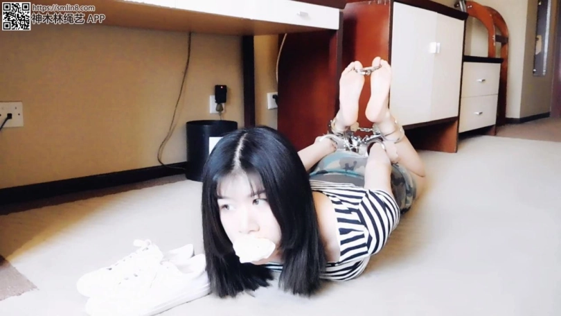 妹子刚回来,看到了桌上的字条,有一个镣铐寻找游戏,找到哪些就把他们锁在身上。妹子觉得很好玩,决定参与。妹子找镣铐,先找到一把链铐,锁在脚腕上。然后找到一个链子脚趾铐,脱下鞋袜,锁在脚趾上。妹子慢慢行走,找到一个脚趾铐,锁在了脚上。妹子最后找到一个三通、手铐、长脚镣,决定玩个刺激的,在地板上驷马镣铐。袜子堵嘴,鞋放在头边上。趴在地板上,长脚镣拴住一只脚,手铐锁住手,三通锁上脚和连接手。妹子很享受整个过程,很开心。妹子觉得有点难受了,却怎么挣扎也弄不开,着急了,要哭了!!!
