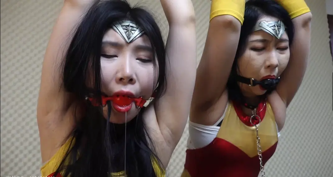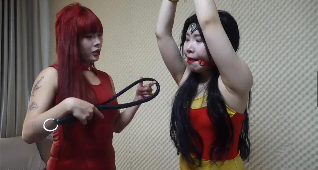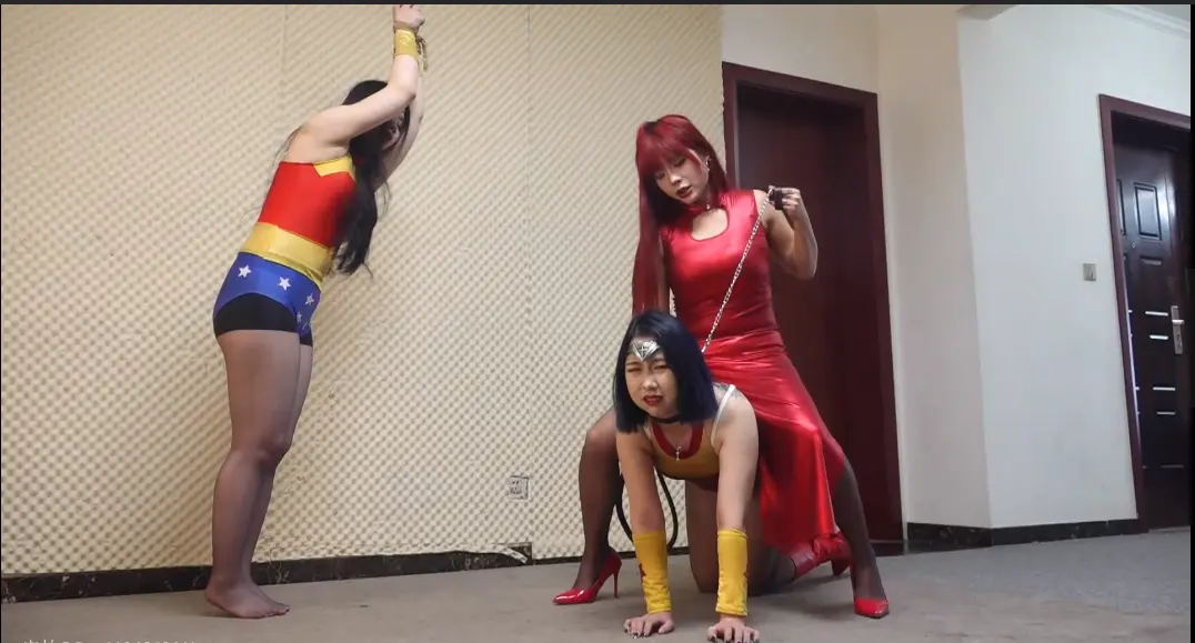神奇女侠女王醒来时发现自己已经被牢牢的吊缚,嘴里戴着口球口水直流。女魔王拿着鞭子狠狠的抽向神奇女侠女王.....