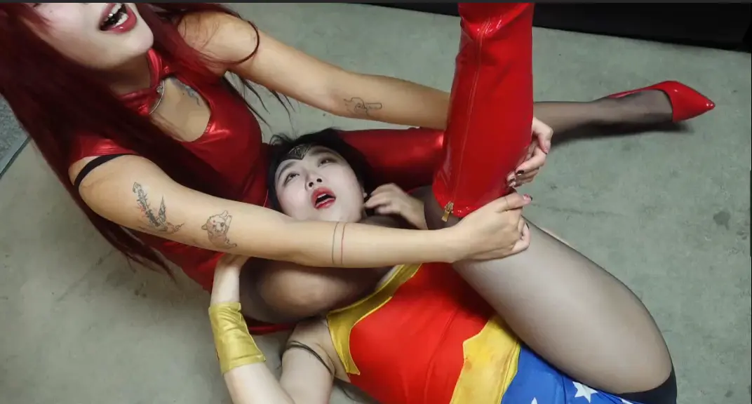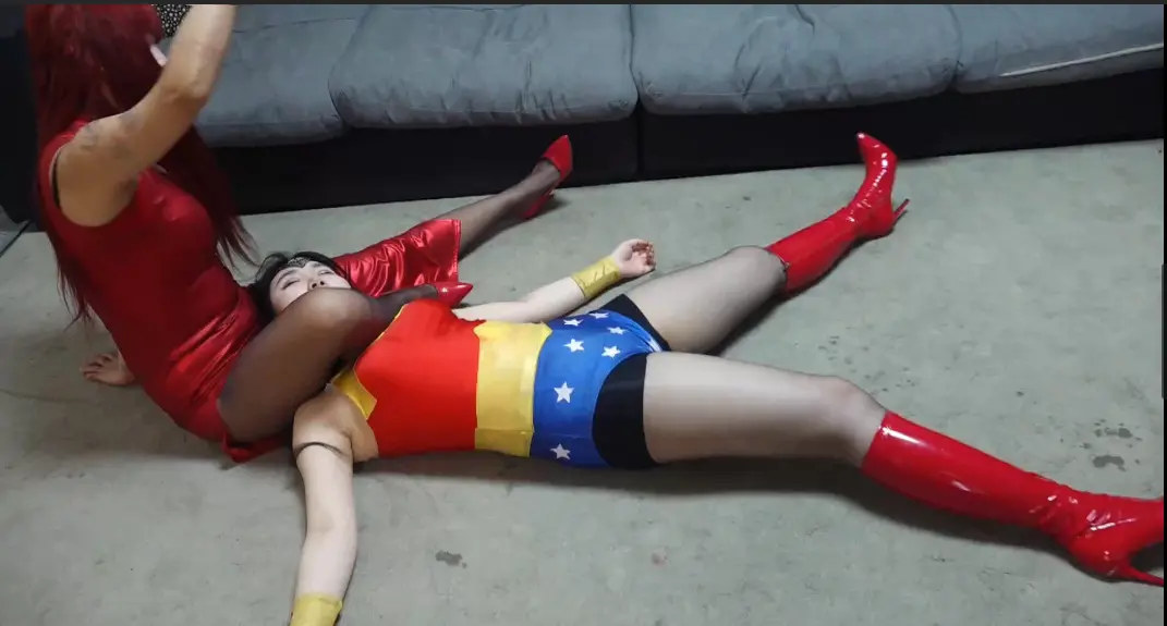 神奇女侠女王前去抓捕女魔王,因为体力能量不足,被女魔王牢牢的十字固腿绞在身子下,神奇女侠女王拼命挣扎、拍打,但是却慢慢的被女魔王用腿勒晕。
