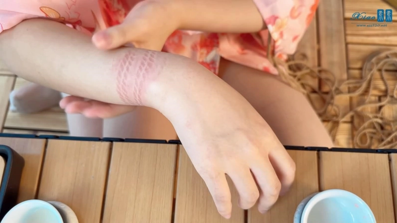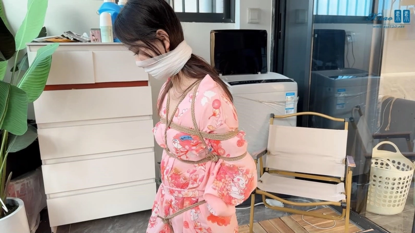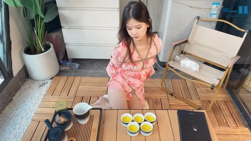 美女模特佳佳粉色和服绳艺品茶