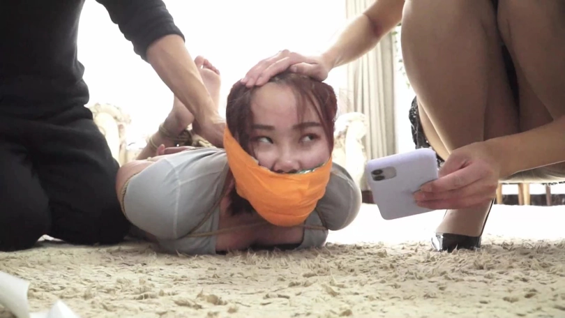 (夏炎与锁哥把想逃跑求救的梁静抓回来,捆成驷马放置在沙发前地上)