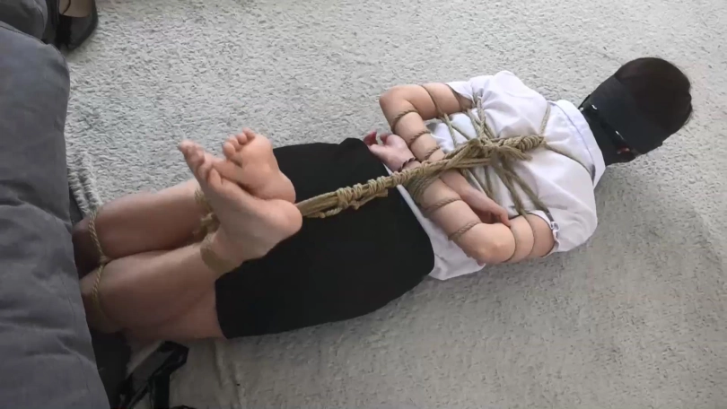 二人手背后拿着束缚工具慢慢走近客厅沙发上坐着的媛媛,很快媛媛就被二人五花大绑,口中被塞口球塞住,发出含糊不清的呜呜声。