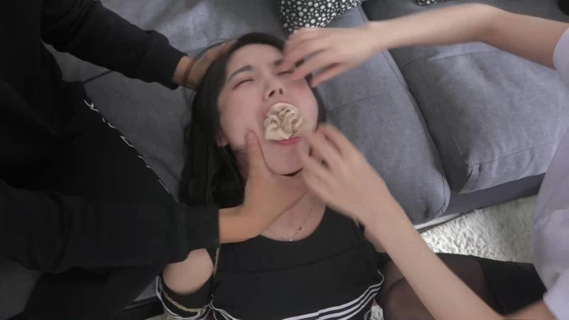 女劫匪对男劫匪耳语几句,不久,男劫匪拿着一条脏兮兮的黑色内裤过来,这正是晓璐穿过还没洗的原味脏内裤,女劫匪解开晓璐勒嘴丝袜,拽出她口中短丝袜丢掉,把这条脏内裤强行塞进晓璐嘴里,塞得晓璐直翻白眼。
