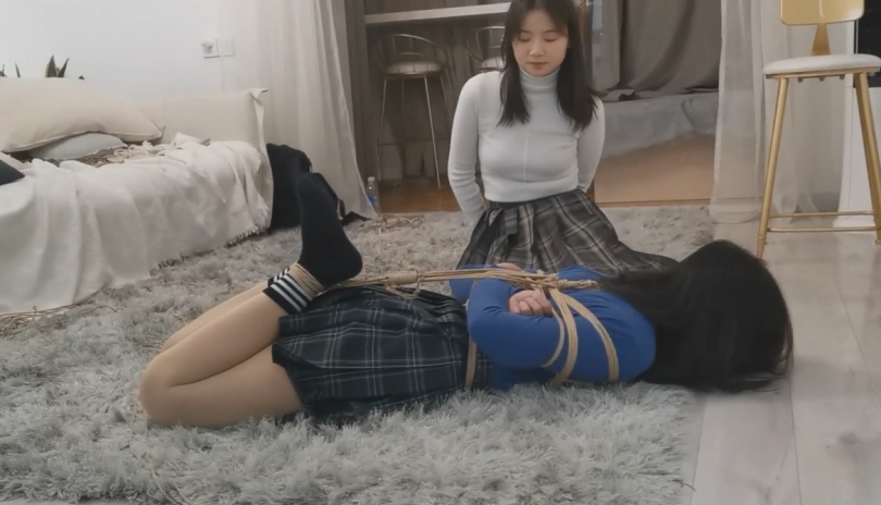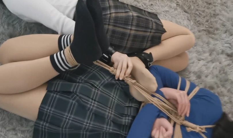 紧缚方式:小叶(双手皮铐中间上锁,双脚皮铐中间上锁,另外用锁连接双手与双脚,驷马锁好)婉婉(上半身日式,双脚紧缚,驷马)