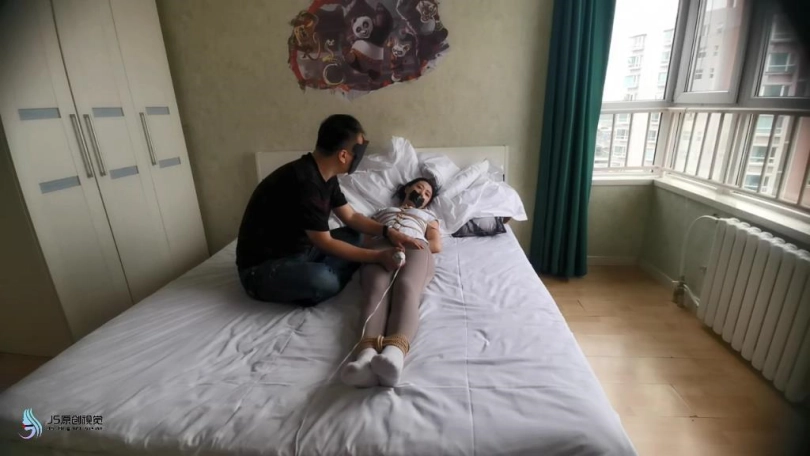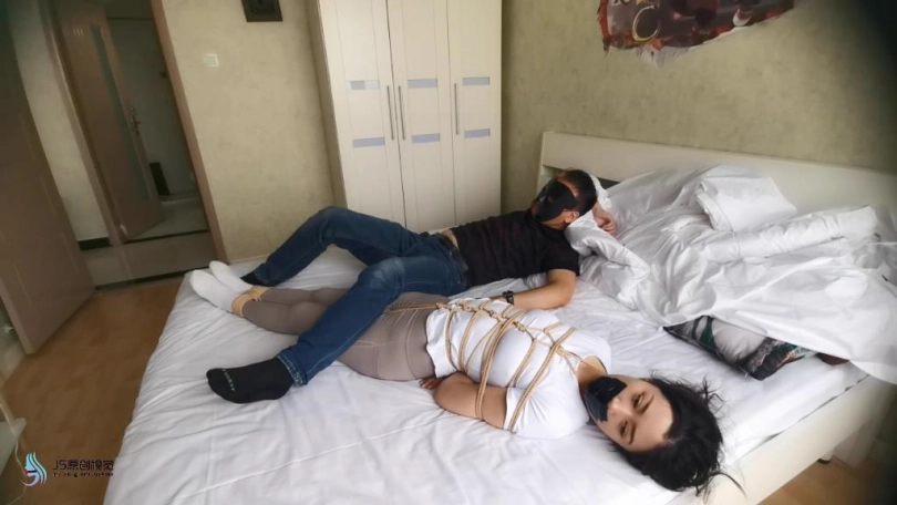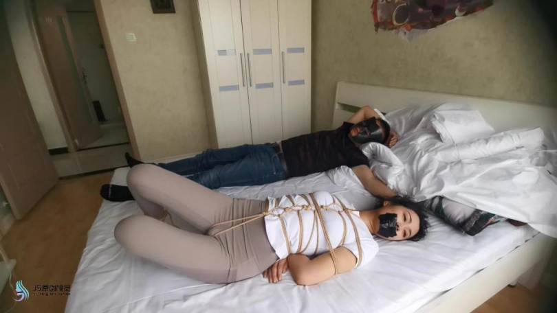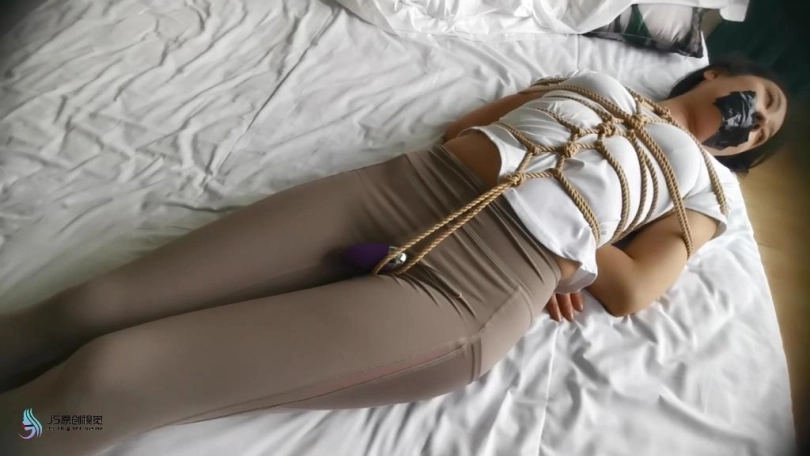 艾可被龟甲捆绑起来,嘴巴用胶带封堵。用快乐棒刺激她的下面,搂着大美女睡觉。艾可在身边被刺激的不断呻吟。接下将跳D放在她的内衣里刺激她的胸部,在固定在下面刺激。