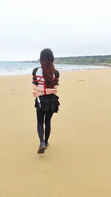 当然上身不会获得自由,依旧是熟悉的红绳日式捆绑,搭配老朋友郊狼啦!这次海边的风非常的大,但是海滩上的人却不见少,露露被捆绑着走在沙滩上自认是吸引力不少人的关注。