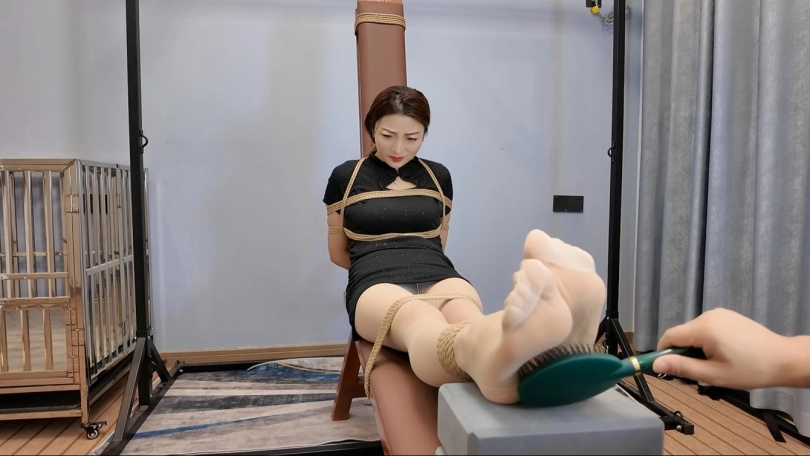 佳佳被绑到老虎凳上刑,挠痒挠的她生无可恋,打脚心,牙签扎脚心,又把腿吊起来挠痒,最终佳佳终于屈服了