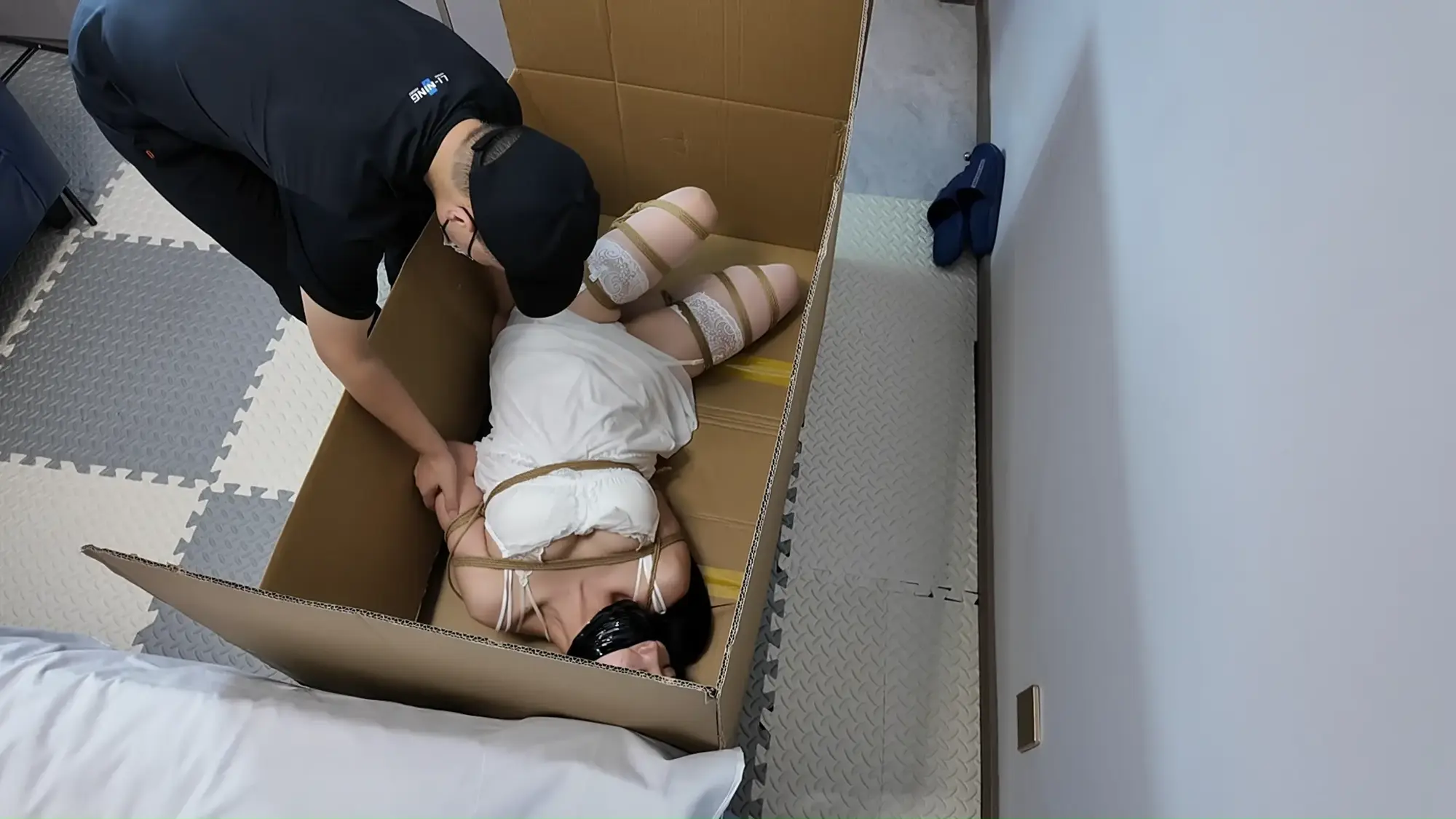 人妻佳佳在家中听到门响,以为是快递上门的她打开门时,迎接她的居然是一位蒙面的陌生男子,随即她就被男子冲入家中一把捂住口鼻,一番挣扎无果后被男子得了手。佳佳被带到房中绑了起来,随后男子离开搜寻财物。趁此机会佳佳试着挣脱,往门外逃,但是男子听到声响,回来把佳佳逮个正着。然后男子将佳佳重新绑起来,给她更加严密的封嘴,佳佳只能无助的挣扎,嘴里发出呜呜声。男子忙活完后带进来一个大纸箱,将佳佳装箱后带走,等待佳佳的将会是......