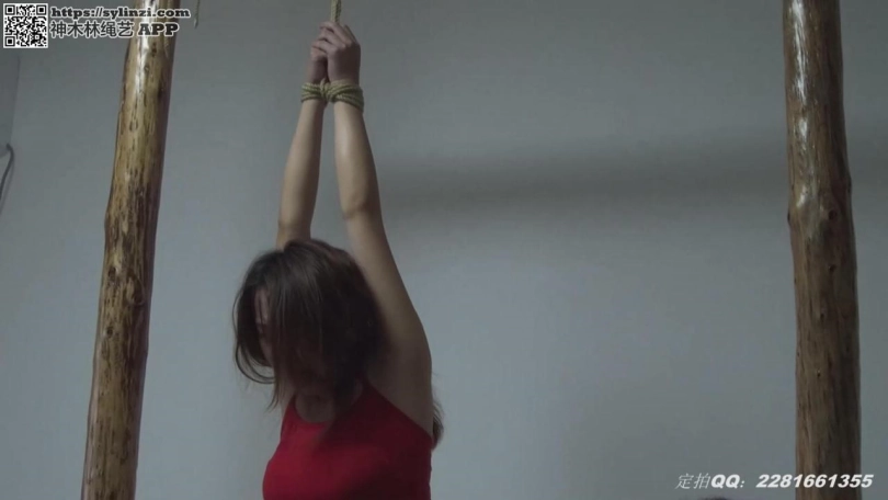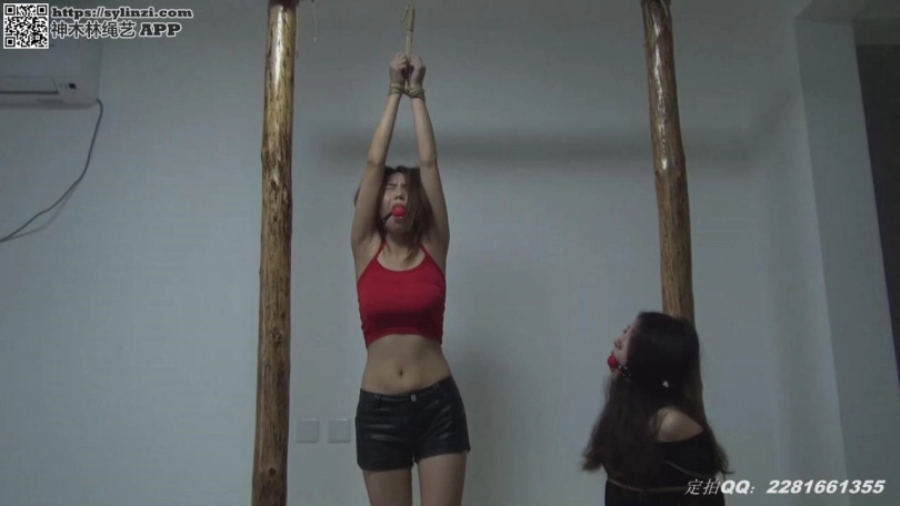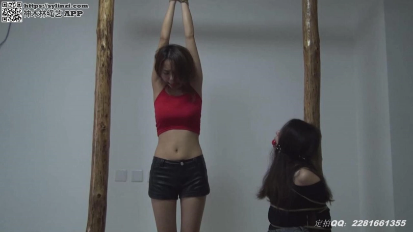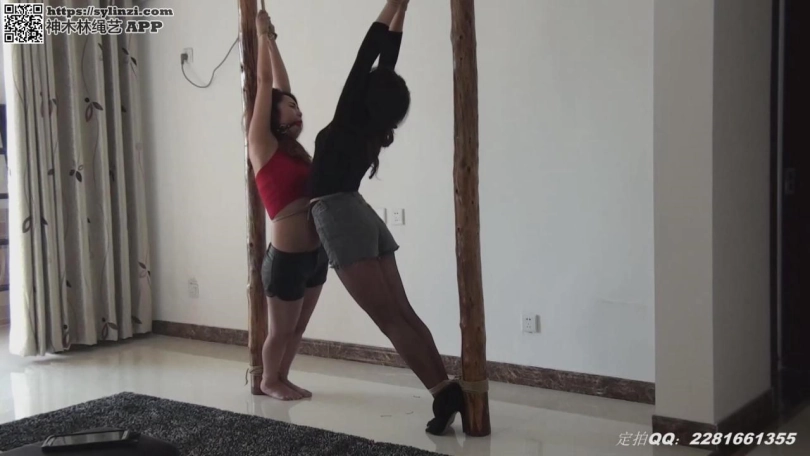 两个美女被捆绑在木桩上,一个裸足,一个高跟,第一个姿势是一个直臂吊缚,一个木桩反手跪缚,第二个姿势是把两女捆在一起,这个姿势特别痛苦,两个美女都快被捆哭了。