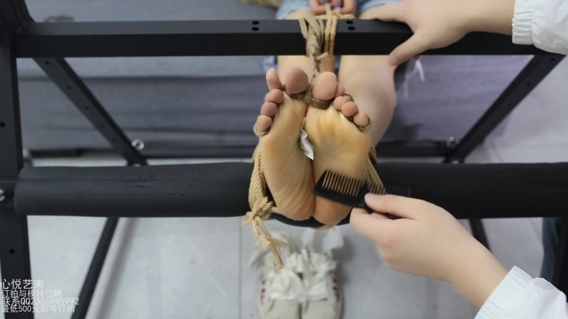 继上次的老虎凳脚枷TK之后,欣然在此挑战超长TK,双脚被绑在一个沉重的铁架上面,十个脚趾也被细绳缠绕绑到后面的铁杆上面,被迫露出粉嫩脚底,再用我平时喝的茶包夹在双脚之间,一旦茶包掉落欣然将迎接5分钟的超频繁全身攻击的TK,最后欣然能否守住jiojio上面的茶包呢,我们拭目以待。PS感觉这是她最接近崩溃的一次TK了,到后期几近虚脱。