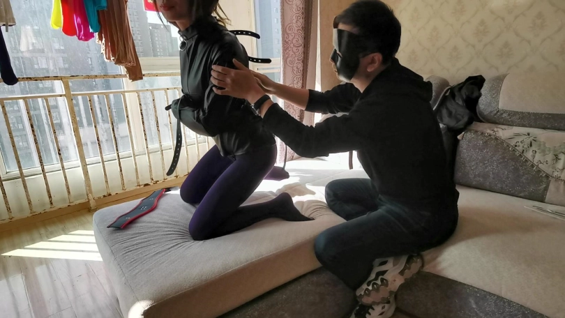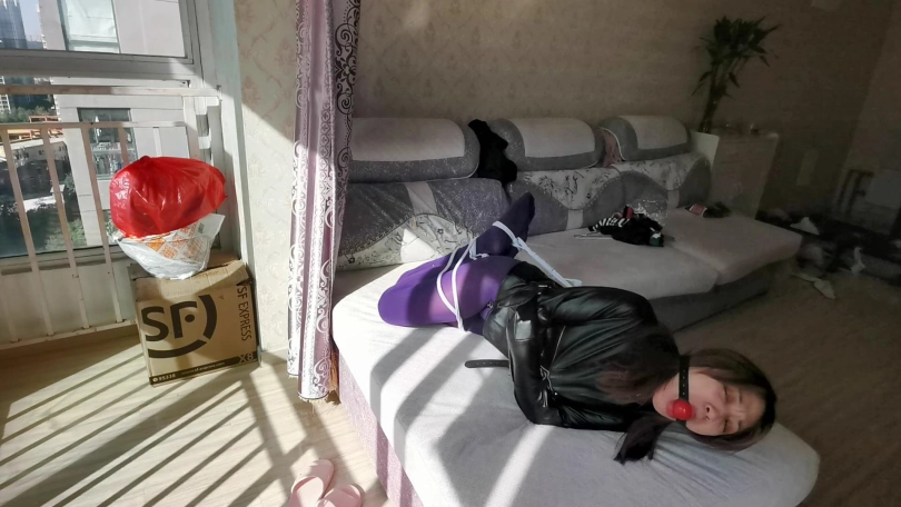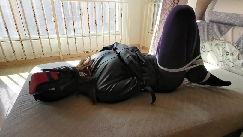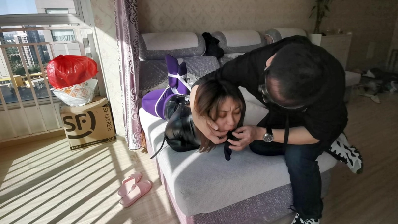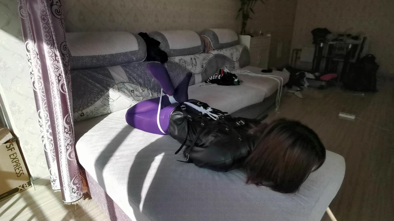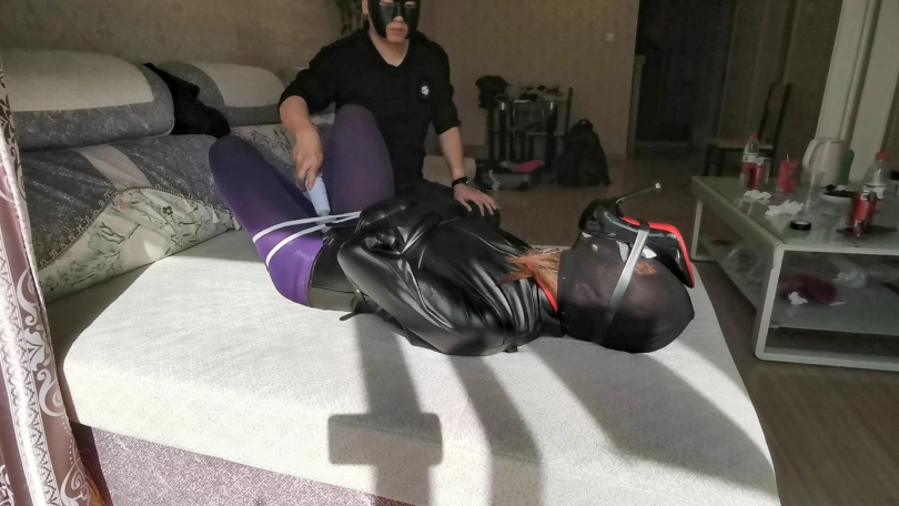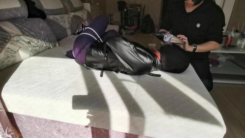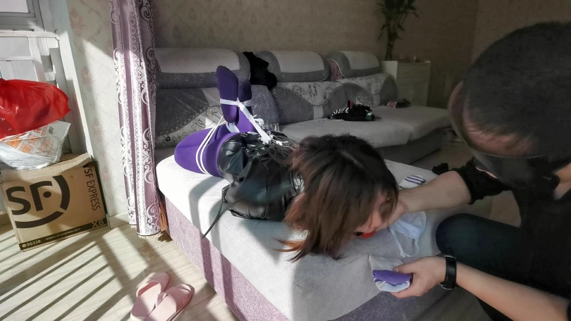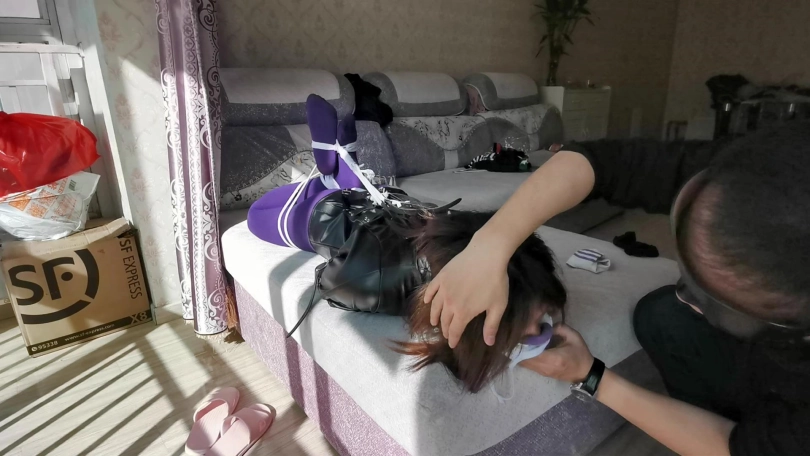 若灵穿着一身紫色连体衣,再给她穿上拘束衣服,戴上皮质脖套。让她趴在沙发上,用绳子把脚捆绑起来,连接到后背绑成驷马。用没洗过的丝袜塞进她的嘴里,再给她戴上口球。用原味棉袜捂住她的口鼻,外面再用超大口罩固定着,这样能保证棉袜一直捂住她的口鼻,强迫她吸入袜子的味道。接下来再丝袜头套,把一直高跟鞋捂住她的脸,当然高跟鞋里放着另外一只原味棉袜,并用胶带将鞋子固定在她的脸上。此时的若灵已经呼吸困难,为了加快她的呼吸,拿出[不可描述]棒对着她下面敏感地带开始强制刺激,若灵开始加快呼吸,这是正常的[不可描述]反应,但每次呼吸都伴随着大量的原味味道吸入体内,就这样若灵被迫的体验着[不可描述]棒和原味侵入的感觉,直到高。。。