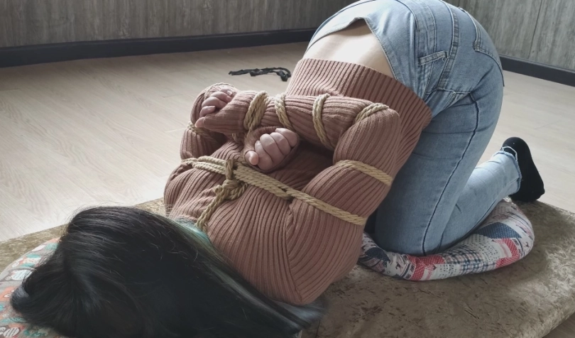 棕色毛衣牛仔裤,白色毛衣运动裤两套衣服。反扭五花大绑。模特丰乳肥臀看起来还是很棒的。