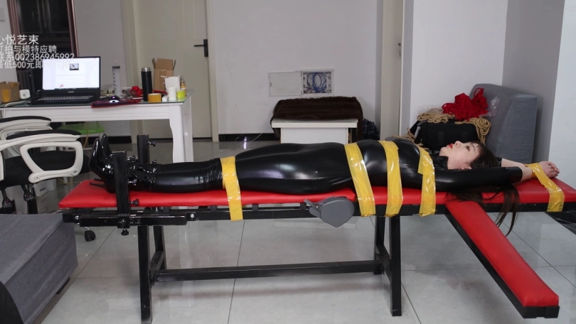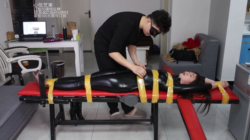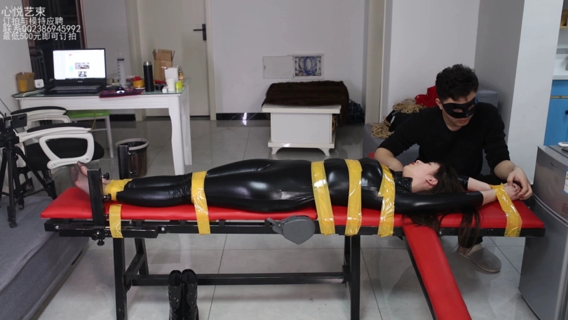 【心悦艺束】美女筱筱的黑色皮衣老虎凳胶带折磨TK