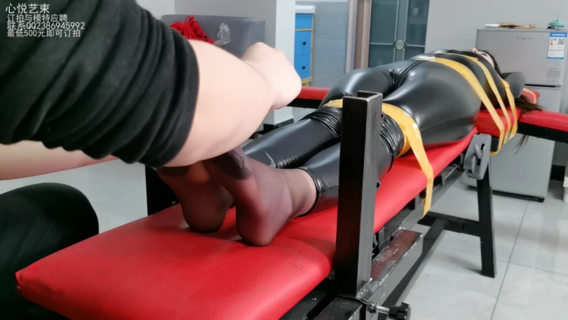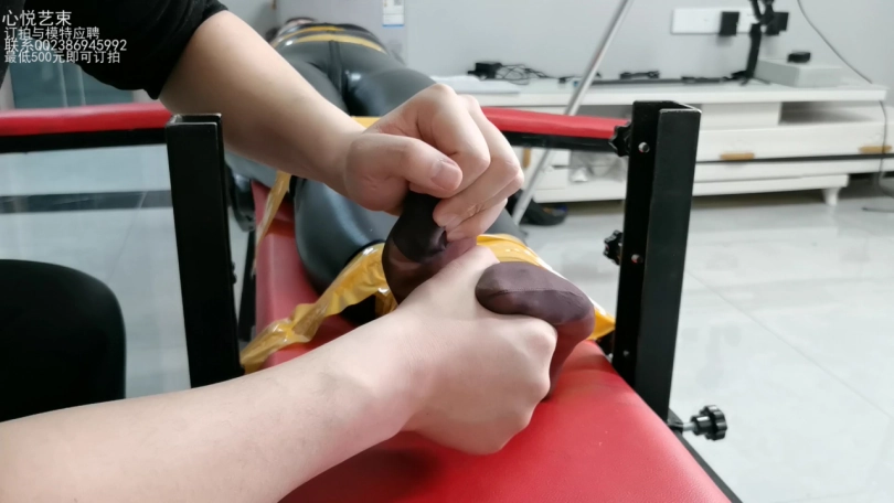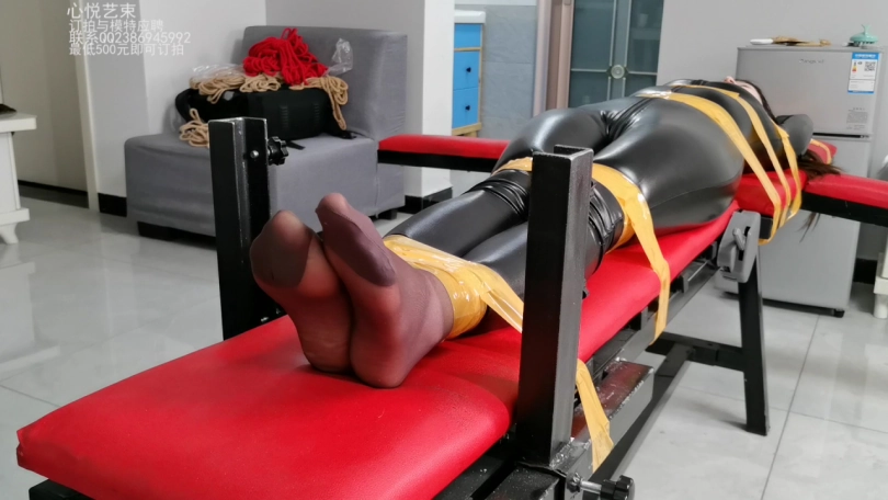 癖好还挺特殊的,全套的皮衣,用增亮剂涂抹了,有亚光效果,丝袜是罕见的咖啡色。用封箱胶带牢牢的束缚在老虎凳上面。疯狂的TK,两只咖啡色的丝袜脚疯狂挣扎。