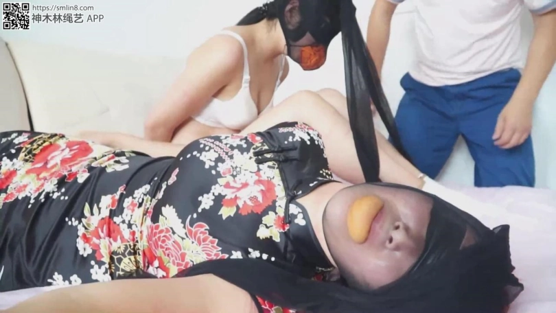 两个歹徒锁上门离开了。密室的大床上,两个女人都被蒙着眼堵着嘴,头上套着丝袜,被背对背捆绑固定得动弹不得。被反