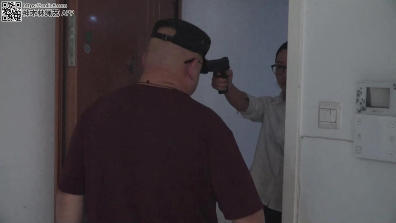 歹徒B刚打开大门,突然被枪口指住逼进屋内,“不许出声!”的同时就被铐住。