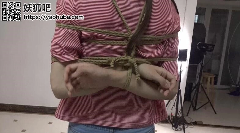 首先是五花捆绑,双重捆腿,然后在来个欧式捆绑,最后戴手铐和重镣。