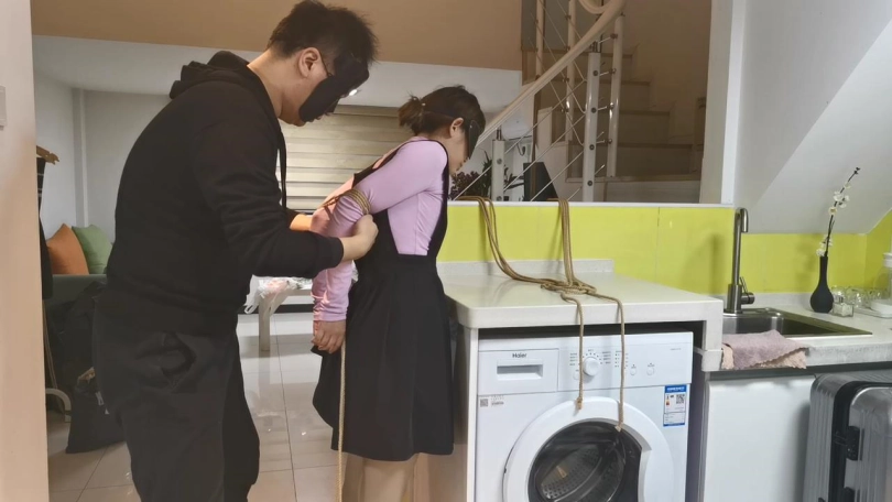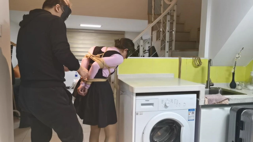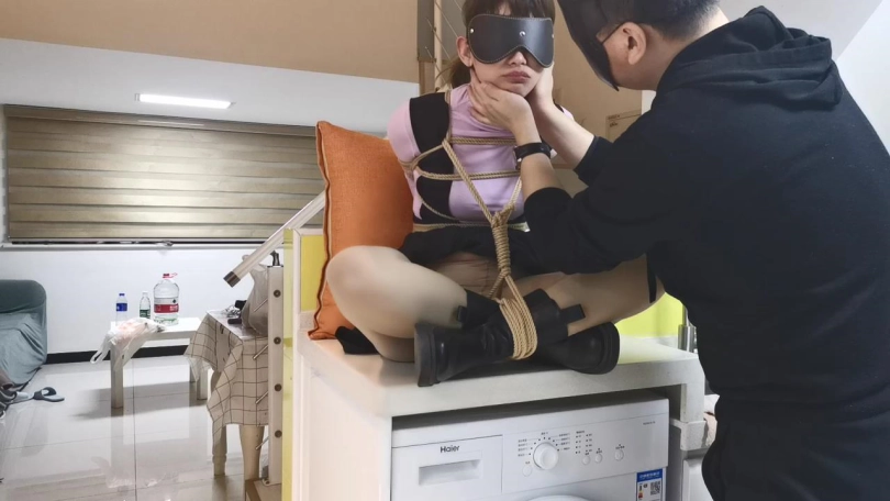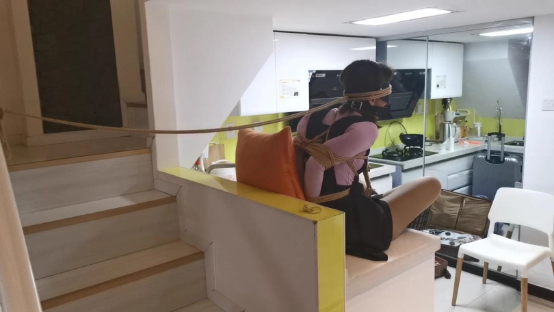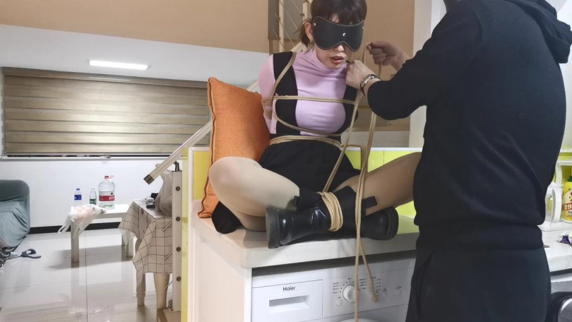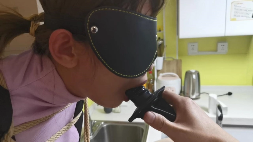 琳洛被团缚捆绑起来,让她坐在台子上,用假YJ口塞塞嘴,眼罩蒙眼。下面被塞进DD刺激着,头部也帮着绳子固定在栏杆上,使她强迫的抬起头,这种姿势很难受,在加上下面的强烈刺激,不一会就被虐哭。。。