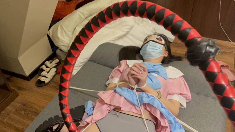 先将小茜带好手铐,然后捆绑在沙发床