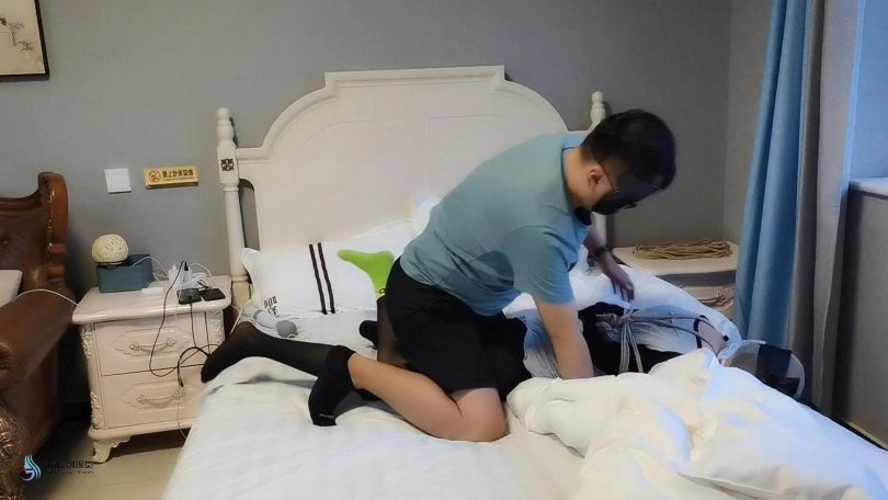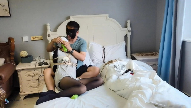 和激辣玩了个绑架游戏。先将她捆绑起来,再用口球堵嘴,外面绑带缠绕封住,丝袜头[X_X]住头部,再带上口罩。脱掉她的一只袜子,放在口罩里,这样能让她闻到自己袜子的味道。用快乐棒对着她的山洞处,不断的持续大功率输出。刚开始她还尝试反抗,但很快再强烈的刺激下发出呻吟声。。。