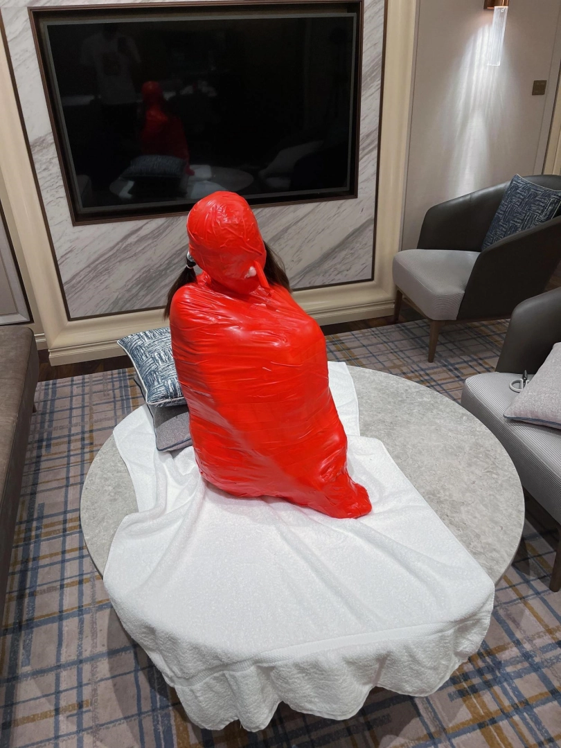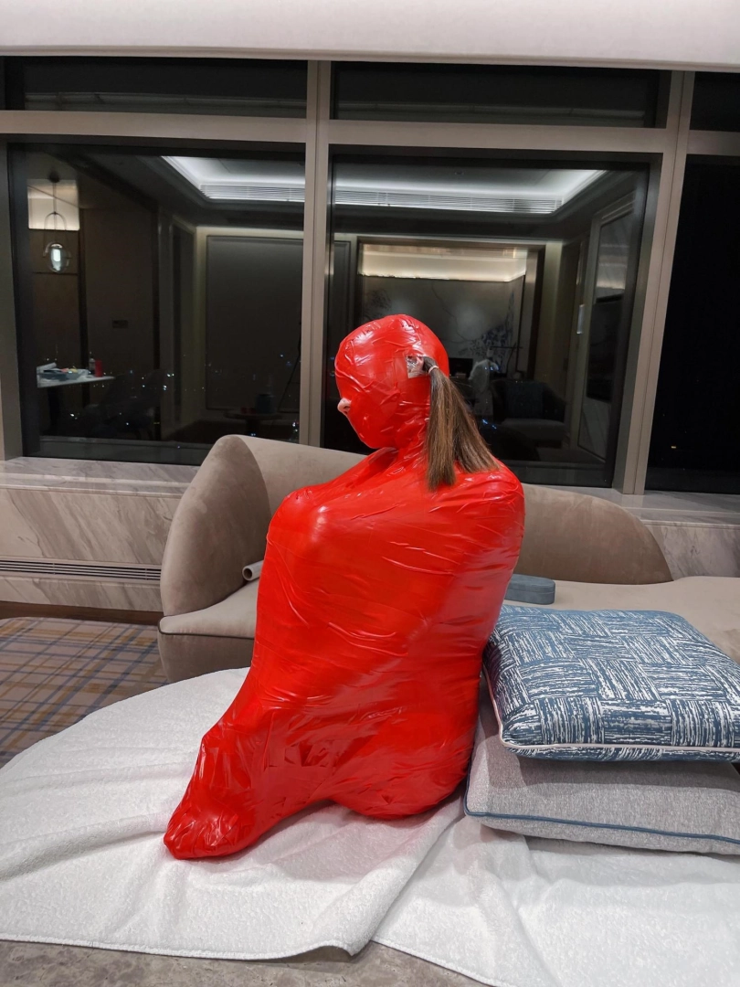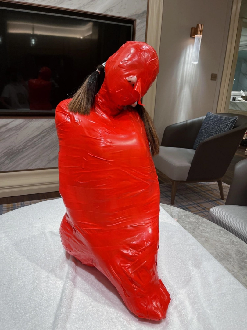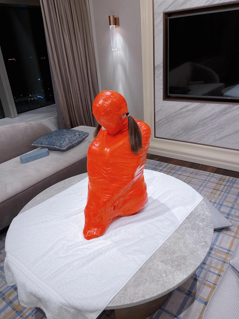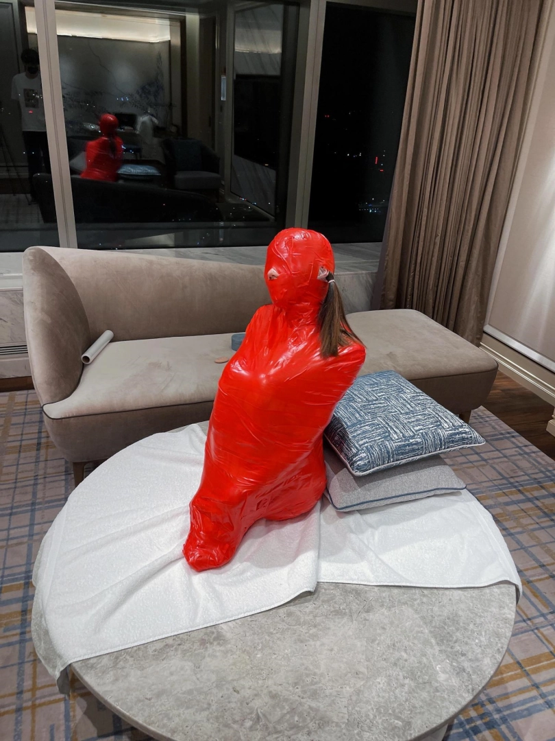 对方先是在茶茶的身体里塞入了玩具,随后茶茶娇小的身体被要求蜷缩起来,随后便被用一层保鲜膜和两层胶带仔细地全包贴好,随即就被摆放在客厅的大理石茶几上,作为一个人体摆件被放置着。