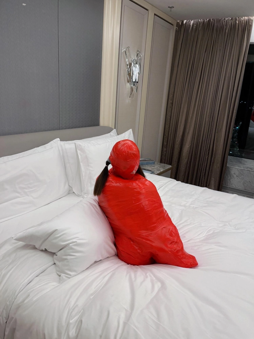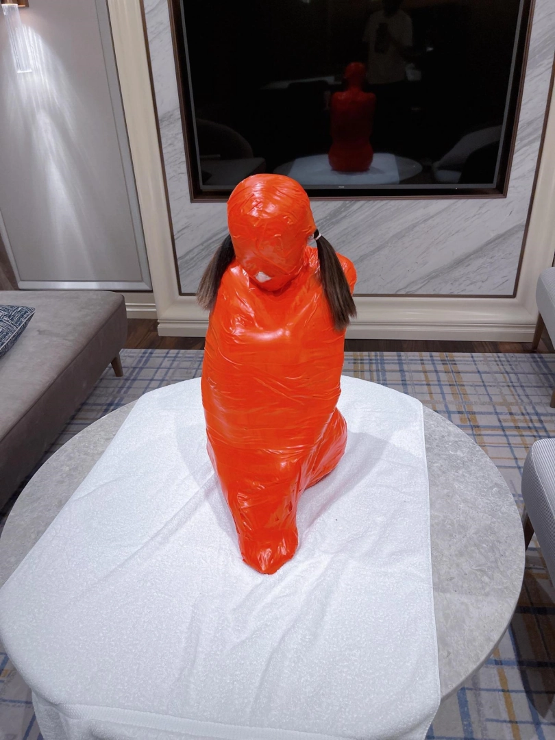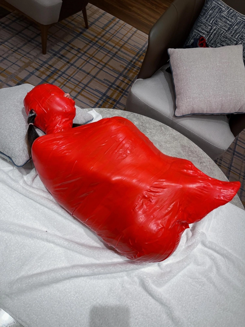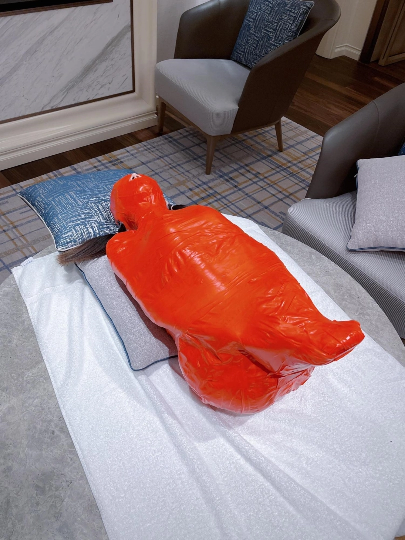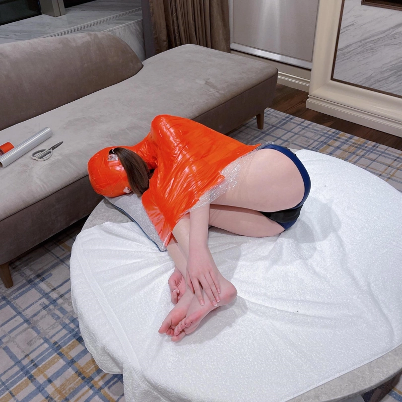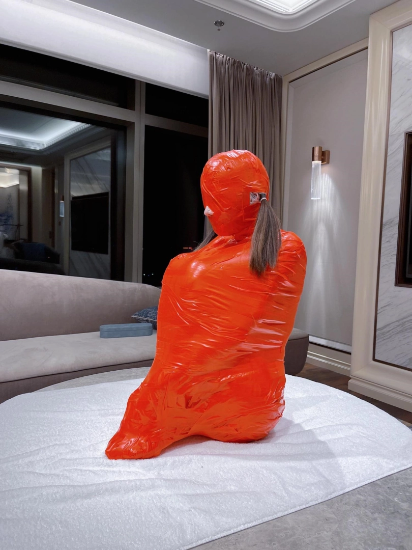 对方先是在茶茶的身体里塞入了玩具,随后茶茶娇小的身体被要求蜷缩起来,随后便被用一层保鲜膜和两层胶带仔细地全包贴好,随即就被摆放在客厅的大理石茶几上,作为一个人体摆件被放置着。