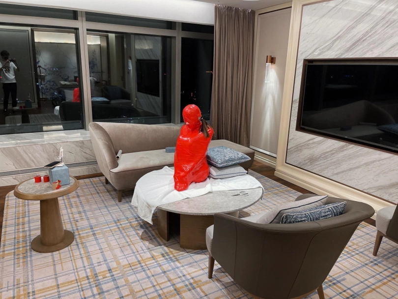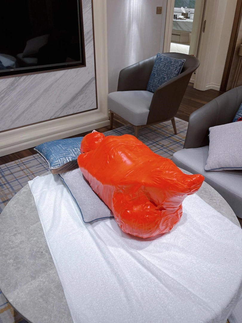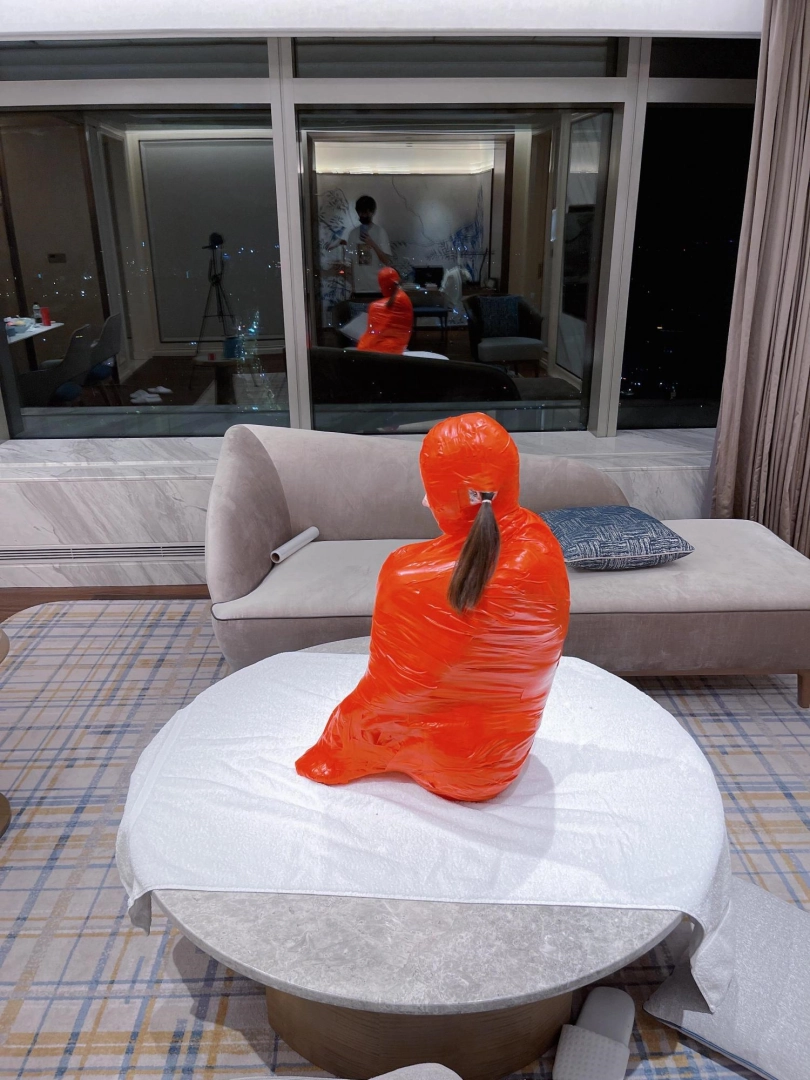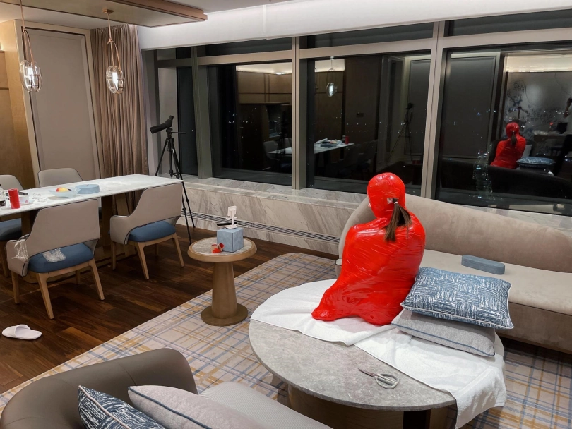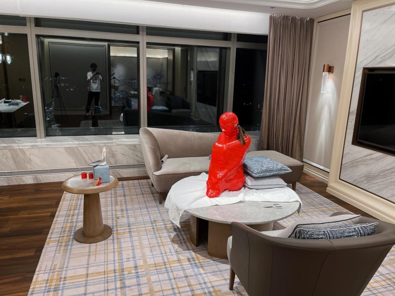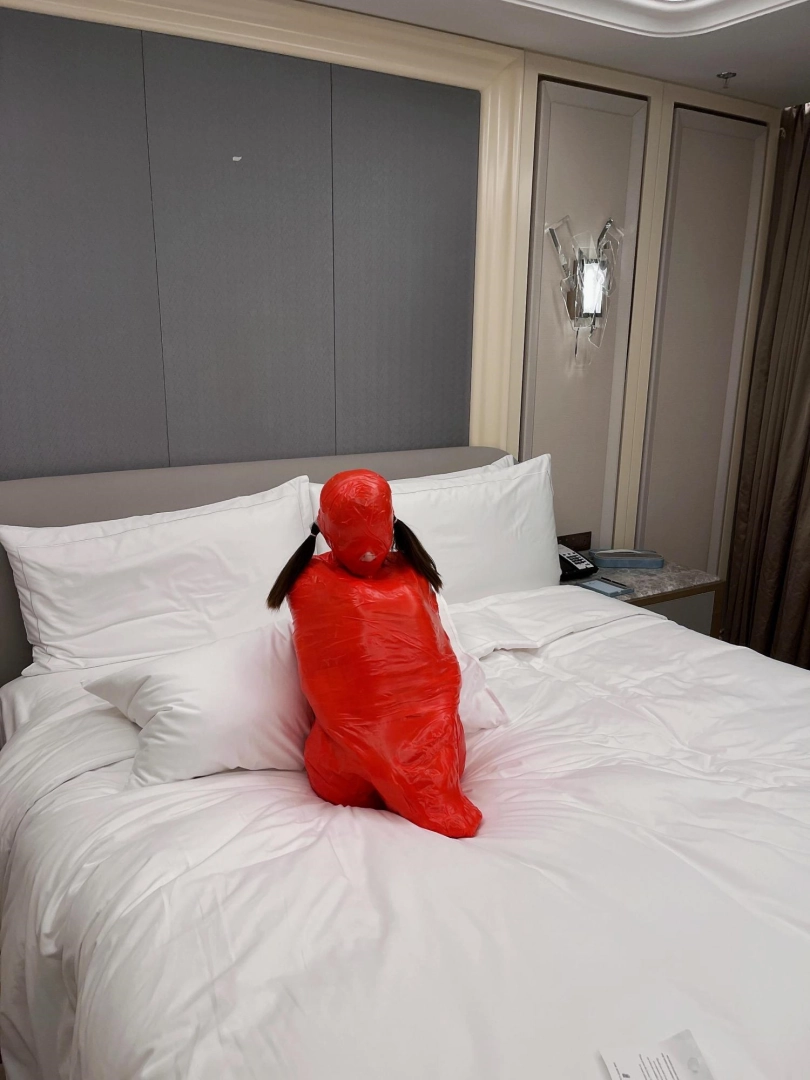 对方先是在茶茶的身体里塞入了玩具,随后茶茶娇小的身体被要求蜷缩起来,随后便被用一层保鲜膜和两层胶带仔细地全包贴好,随即就被摆放在客厅的大理石茶几上,作为一个人体摆件被放置着。