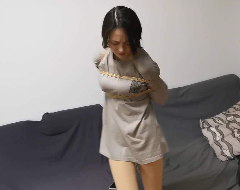 由于双腿被捆的太紧,小兔一用力,双脚就没有办法站稳,摔倒在了沙发上。挣扎着坐起来后。有奋力的挣扎了起来...。大约过了五六分钟后,绳上的绳子丝毫没有要松开的痕迹。