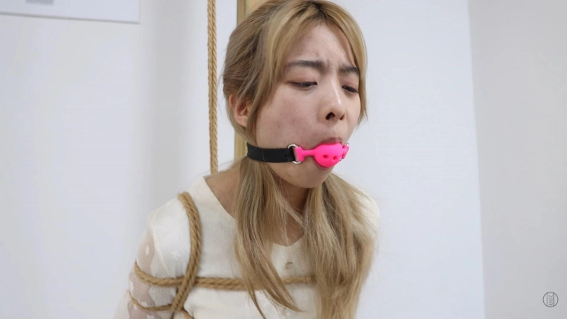 踮起脚尖的珊珊呜呜的叫着,口球将自己的脏袜子推向喉咙深处,可背后吊高的手根本无法将绳子解开,她就这样挣扎着,身体被绳子勒的疼痛,却难以言表。