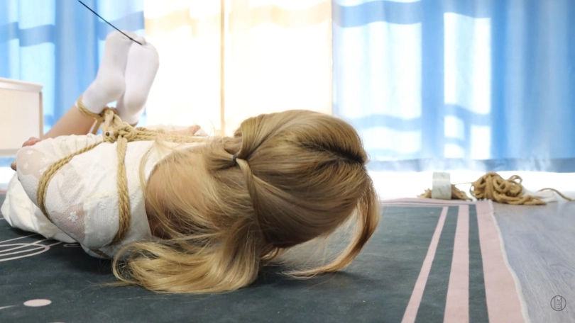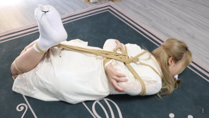 数日后的一天,许斌因外出夜不归宿,但他给珊珊留下了任务,早已被驯化的珊珊立刻执行,将自己脚上的原味白棉袜一只一只的塞进嘴里,重新穿好白棉袜后又用扎带将脚趾也绑在一起,珊珊努力的还原着许斌对自己做过的一切,终于将自己绑好后,她享受了一番。但她本能的觉得,这样还不够,便挣扎着跳到一处角落,取来了绳子,将自己更进一步的绑成驷马。