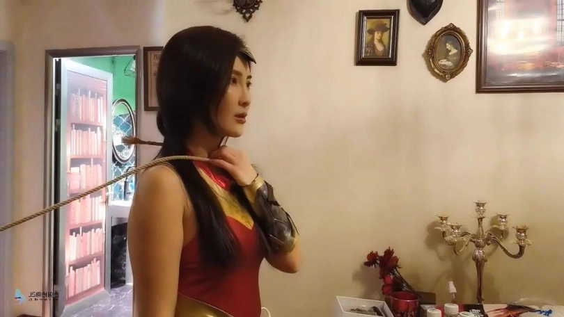女超人潜入房间调查,却不知自己已经身陷陷阱中。发现桌上有很多绳子,正在疑惑时候,一条绳子从后面突然袭来缠住了她的脖子,并将她拉到沙发上。女超人奋力的挣脱着。但她的脚也被绳子缠绕束缚了起来。双手也被绳子缠绕,拉扯到身后束缚起来。越来越多的绳子开始向女超人袭来,被束缚的女超人只能惊恐的挣扎着。。。