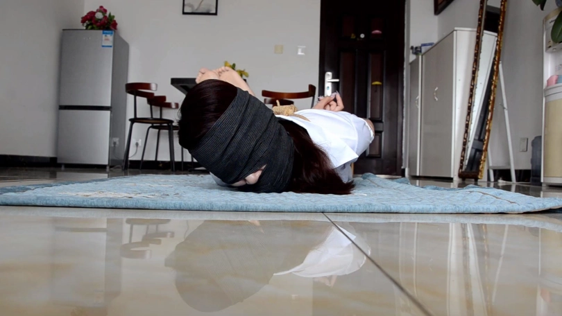 好不容易想办法坐到地上想找工具脱缚,没想到歹人从卧室里出来正好看到女孩,女孩拼命呜呜呜闷哼。