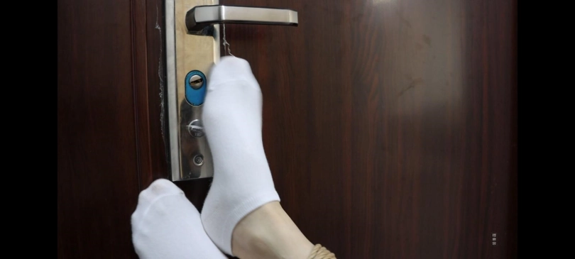 小丁和珊珊是一所学校的学生,小丁有一个特殊的癖好就是喜欢女孩子的白袜脚,这天小丁偷偷潜入了珊珊的家,找到了珊珊的原味白袜,就在他陶醉的闻的时候,正赶上珊珊回家,珊珊见了怒骂小丁变态,并打算报警,小丁一不做二不休将珊珊捆绑了起来。捆绑完珊珊依旧对小丁破口大骂,小丁忍无可忍把自己找到的原味白袜塞到了珊珊的嘴巴里,然后用透明胶带封住。做完这一切的小丁继续去家中寻找珊珊的原味袜子,这是的珊珊心想不能够坐以待毙,于是自己踢掉了鞋子,挪动到了门边,企图用脚拧开门把手,就在快成功的时候被小丁发现,又被抓了回去。