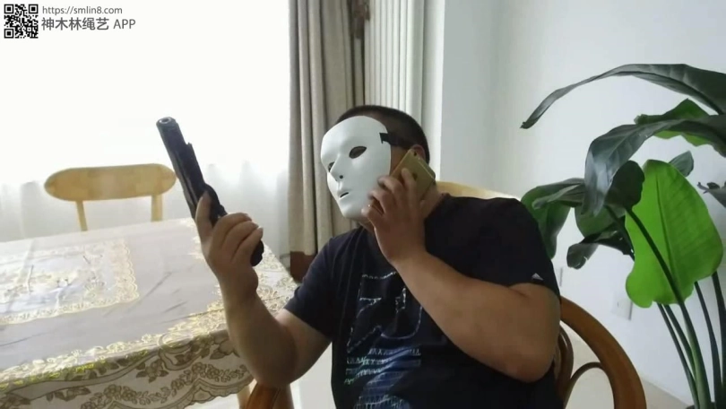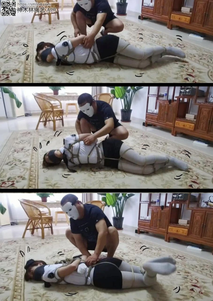 美女看男人走了,赶紧想办法挣脱,但她低估了匪徒的狡猾,她身上的绳索不仅牢固,而且她的手部还被套了厚袜子,袜口还被胶带封死,所以她根本无法解缚。