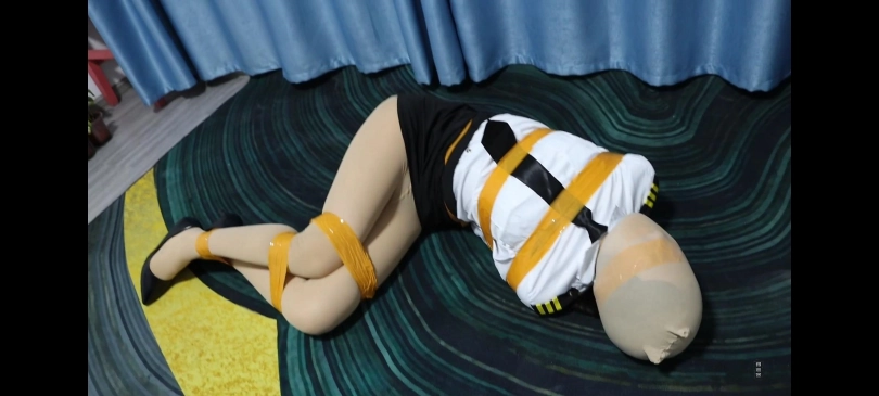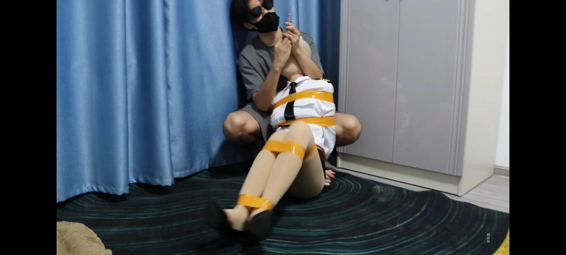女机长米娅被人贩绑架,身穿制服丝袜,放置在房间的角落里。全身被胶带捆绑,嘴巴和眼睛也被胶带封住,头上套着丝袜头套。最后人贩看她不老实,给她注射了一针镇定剂,然后将她装进了麻袋里。