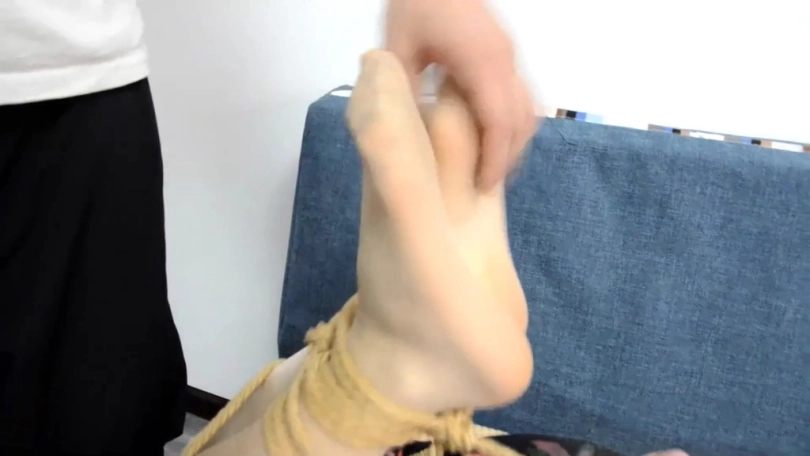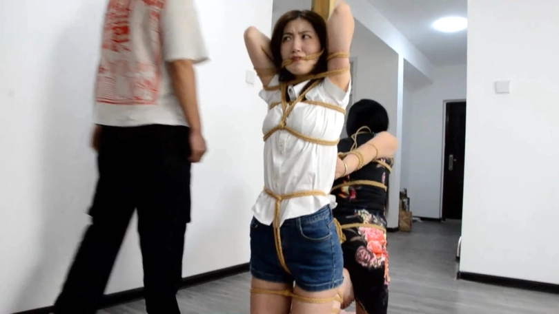 二女被歹徒迷晕后绑在了一个柱子上,分别用一根绳子勒住小嘴。歹徒摸遍了二女娇躯,二女极力的躲闪可是无法逃离绳子的禁锢。歹徒又拿出一个双人口球,先将二女绑成驷马,接着面对面放在一起,用口球连接起来。二女一边忍受着口球的屈辱,一边还要接受鞭子的抽打和脚心被不断的挠痒,只能无助的呻吟。