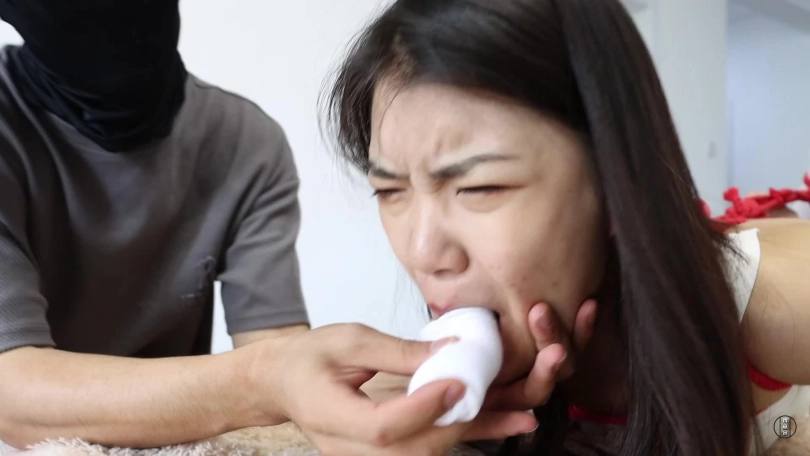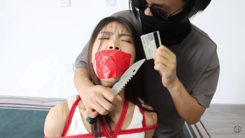 小偷潜入家中盗窃,躲在房间里听到女主人回来后,一不做二不休的把女主人控制捆绑起来。开始,女主人上半身被采取日式紧缚,下半身被股绳加蛇缚紧紧捆绑的靠在墙上,小偷用一块毛巾揉成一团,塞到女主嘴巴里,随后用五张布基胶带将嘴巴牢牢封住,男主为测试女主还能发出多少声音,强迫她呜呜呜地叫喊,见女主只能呜呜呜后,小偷放心,把她靠在墙上了后去翻找财务,女主在墙边挣扎,一会,男主拿来了一个大的长帆布袋,尽管女主不情愿的呜呜可还是被小偷强行塞入帆布袋中,塞入帆布袋打好结后,小偷见女主还乱动,踹了几脚后,又用红色绳子把帆布袋牢牢捆绑住(如图视觉冲击很强)感觉绑结实了,男主继续寻找财务,而女主在袋里挣扎并呜呜呜。一会男主拿着银行卡过来,将女主从帆布袋里放出来,虽然用刀威胁命令她说出密码,女主只好说了密码,随后就被捂晕。镜头一转,已经嘴里戴着口球,身子大字捆绑在床上,努力挣扎。一会男主来了,表示:拿到钱了,但还想玩玩她。随后强行扒了女主的靴子,开始用齿轮,夹子玩弄她。齿轮挠脚心及全身,夹子夹脚趾,让女主痛并快乐着。玩了会,觉得女主喊叫太大声,就脱了她的袜子,用原味堵住她的嘴巴后用银色胶带封上,继续玩弄,直到女主爽为止。一会,男主累了,决定给女主喂些吃的,好戏来了,这里又有耻辱喂食,女主被直臂缚加驷马倒攒蹄捆绑着吃面包很屈辱。不等女主吃完,男主又用刚给她穿上的鞋袜,(被鞋子熏过的袜子堵嘴),原味白棉袜塞入嘴巴后,接着白色绷带缠绕,三块红色布基胶带,三块灰色布基胶带封住,布基胶带封好,又用粉白静电胶带缠绕住,以此女主有口不能言了,难受得呜呜,楚楚可怜。女主挣扎给力不少于四分钟。