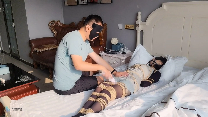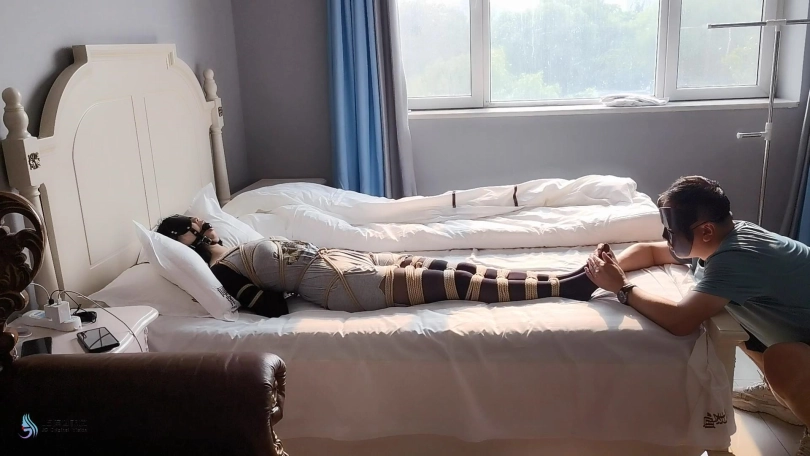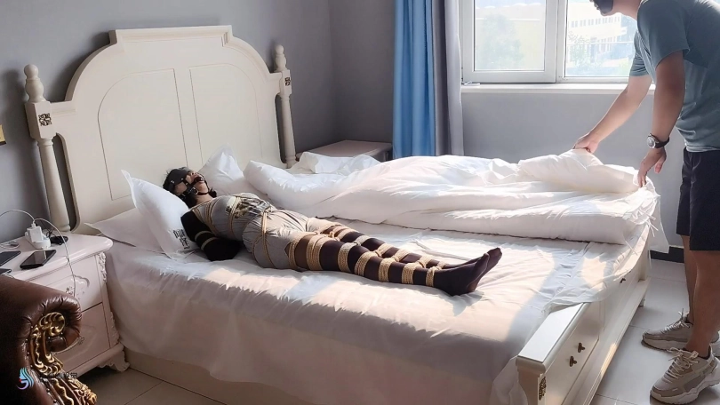 激辣在家无聊的刷着手机,突然想起敲门声,激辣起来去开门。就在开门声响起的同时,也传来了激辣被捂住嘴巴发出的“呜呜”声。当画面再次亮起时,我们的主角激辣躺在床上,身上盖着被子。她的嘴上戴着马具型口塞眼罩,她看上去很安静,应该是在睡觉。这时坏人掀开了被子,露出了被绳子密集捆绑起来的身体。坏人开始抚摸起激辣的脚丫。随着不断的触摸,激辣也清醒了过来,发现自己被束缚的不能动,惊恐的“呜呜”叫。但这更激发了男人的欲望,男人捧起女孩的丝袜脚开始亲吻起来,并时不时的挠着女孩的脚底。。。